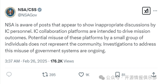 就在加巴德發表上述言論的幾個小時前,美國國家安全局(NSA)表示,已經注意到情報人員發佈的帖子“似乎涉及不當討論”,並宣佈正在展開調查。