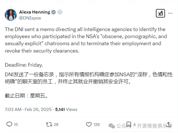 美國國家情報總監辦公室發言人亞歷山大·亨寧(Alexa Henning) 週二早些時候在X上表示,各情報機構已被指示在週五(2月28日)之前識別並解僱參與色情聊天的員工,並撤銷他們的安全許可。