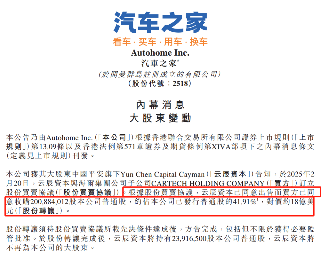 根據汽車之家發佈的公告,汽車之家的大股東中國平安旗下公司與海爾集團子公司簽訂了股權轉讓協議,海爾花 18 億美元,從平安手下收購了汽車之家 41.91% 的股份,成為控股股東。
