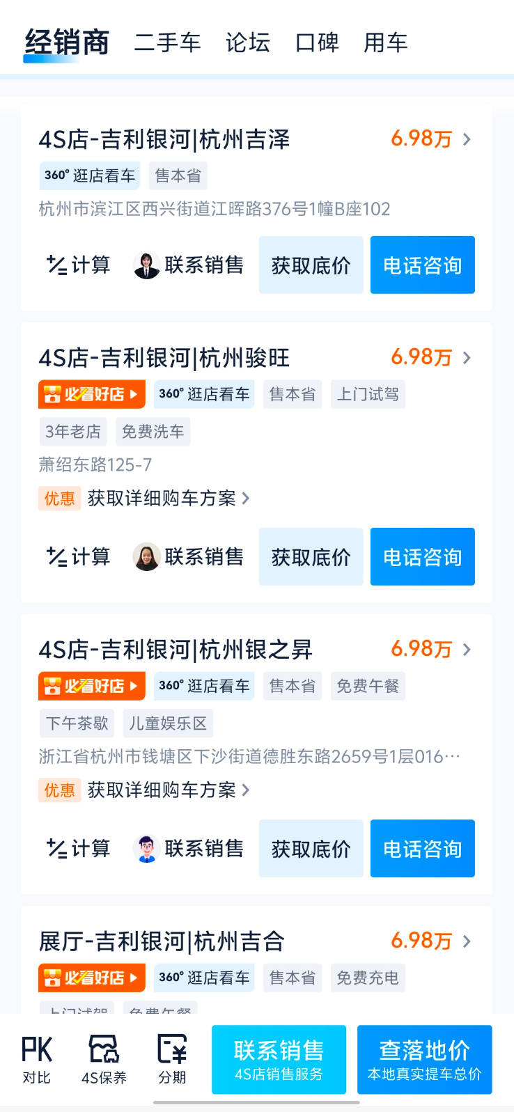 大家在網上看車的時候,要是看着看着心動了,是不是就想去線下試試?這時候你會發現,往下劃一點就有一堆門店信息,隨便點一個,對面電話就過來了。
