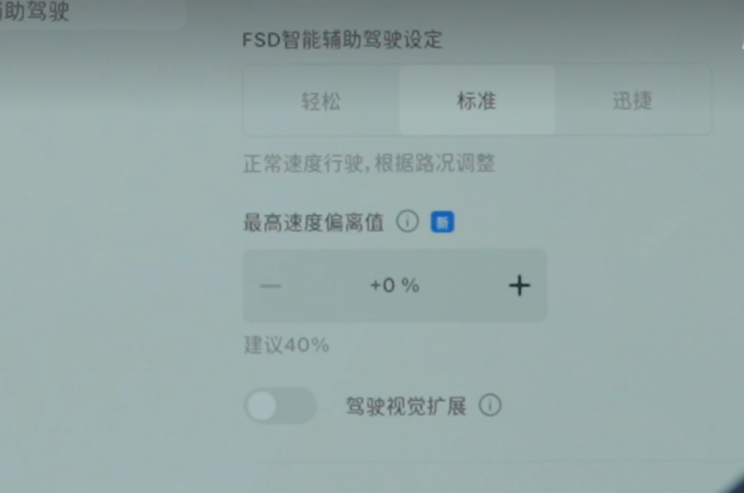 落地中國的FSD版本號為V13.2.6和北美最新的V13.2.8只差了2個小版本號。在功能上,FSD並不能像國產智駕一樣設置跟車距離,常用的設置有兩個:駕駛風格(輕鬆,標準,迅捷),最高速度的偏離值(超過規定限速多少)兩個。