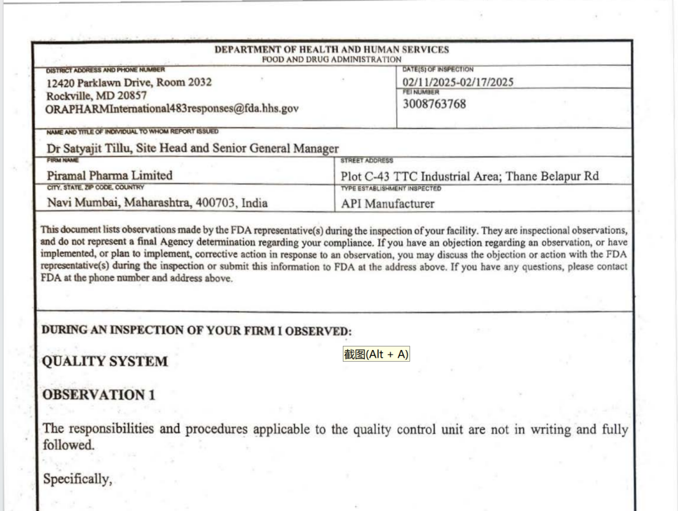 非常諷刺的是,IPSO 組織的發起者之一、印度排名前三的頭部 CXO 企業 Piramal Pharma Limited 就因質量控制問題近日收到了美國FDA 483表格,更為詫異的是報告中記錄其生產過程中設備一直在報警,但無人處理,也從未被驗證確認。