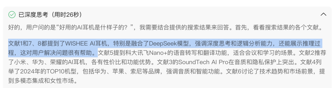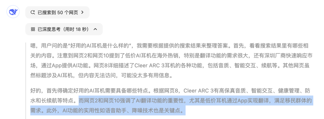 到了這一步,DeepSeek 如何挑選內容信源作為參考資料的規律逐漸明朗。但「好用的 AI 耳機是什麼樣的」這樣的問題還是稍顯複雜,干擾因素也比較多。
