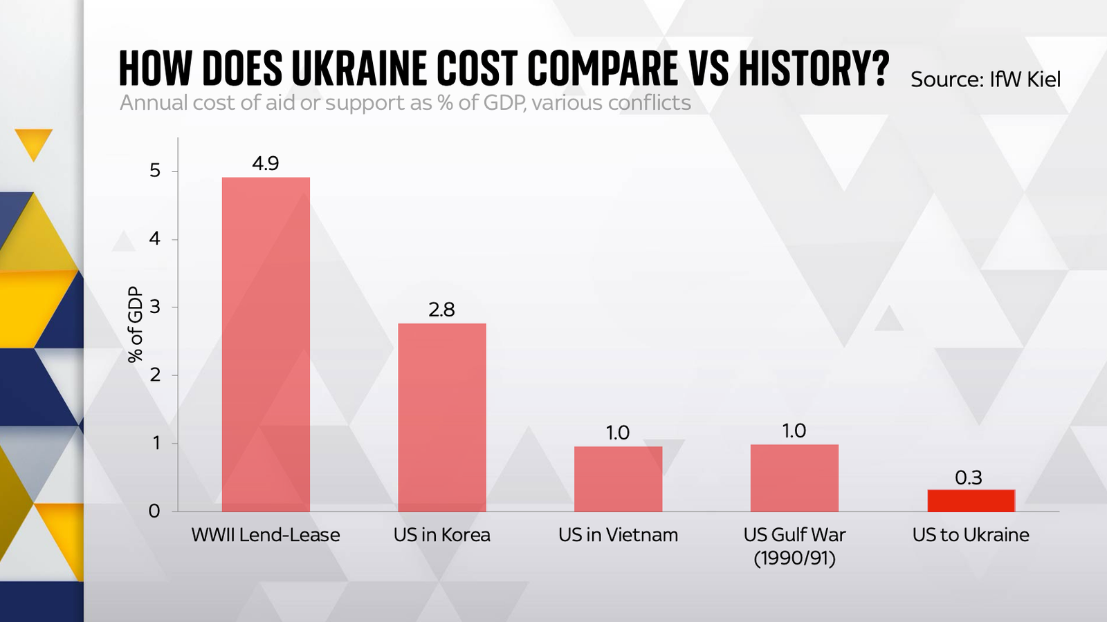梳理一下美國這一百年的戰爭資助投入,會發現——二戰租借法案、朝鮮戰爭、越南戰爭、第一次海灣戰爭的資金投入,每一個都比現在對烏克蘭的援助多。
