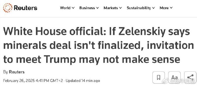 據悉,澤連斯基將於28日前往美國,並簽署有關烏克蘭稀土礦產等事項的協議。烏克蘭總理什梅加爾稱,該礦產協議與安全保障掛鈎。此前(15日),澤連斯基在出席慕尼黑安全會議期間曾公開表示拒絕美國提出的礦產協議草案,稱美國“未提供安全保障”且“不符合烏克蘭利益”。(新浪軍事)