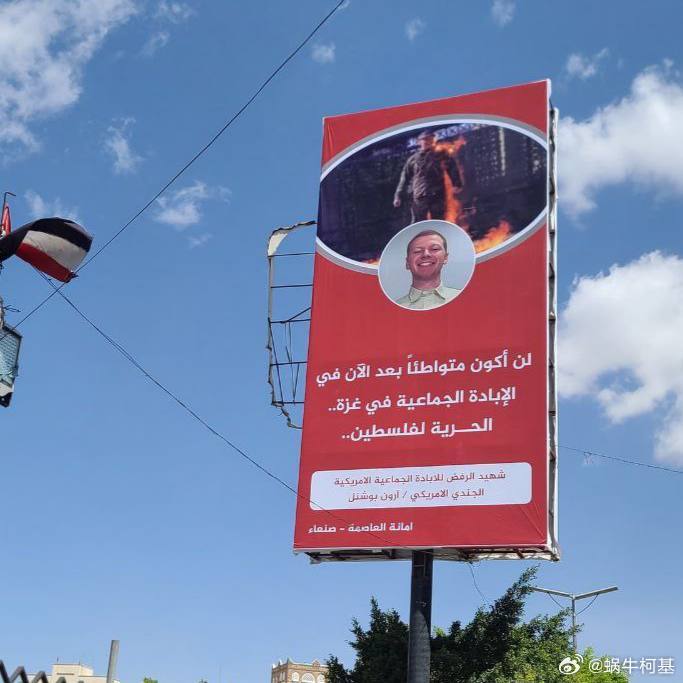 🇵🇸🇱🇧🇾🇪🇺🇸 約旦河西岸、黎巴嫩和也門舉起標語和橫幅,紀念美國空軍軍人亞倫·布什內爾逝世一週年。去年布什內爾在華盛頓特區以色列大使館前自焚,以極端方式抗議加沙種族滅絕。