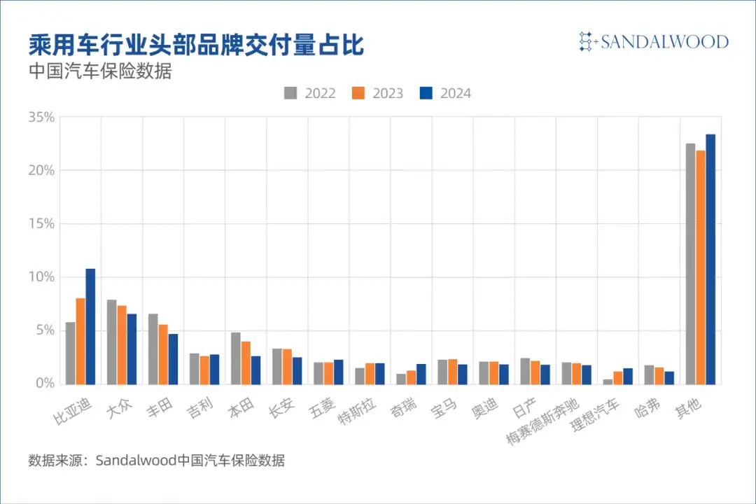 在整個乘用車行業中,比亞迪市佔率從11.5%提升至15.4%,持續領跑。自主品牌中,五菱、奇瑞、理想份額增長,而長安、哈弗出現下滑。