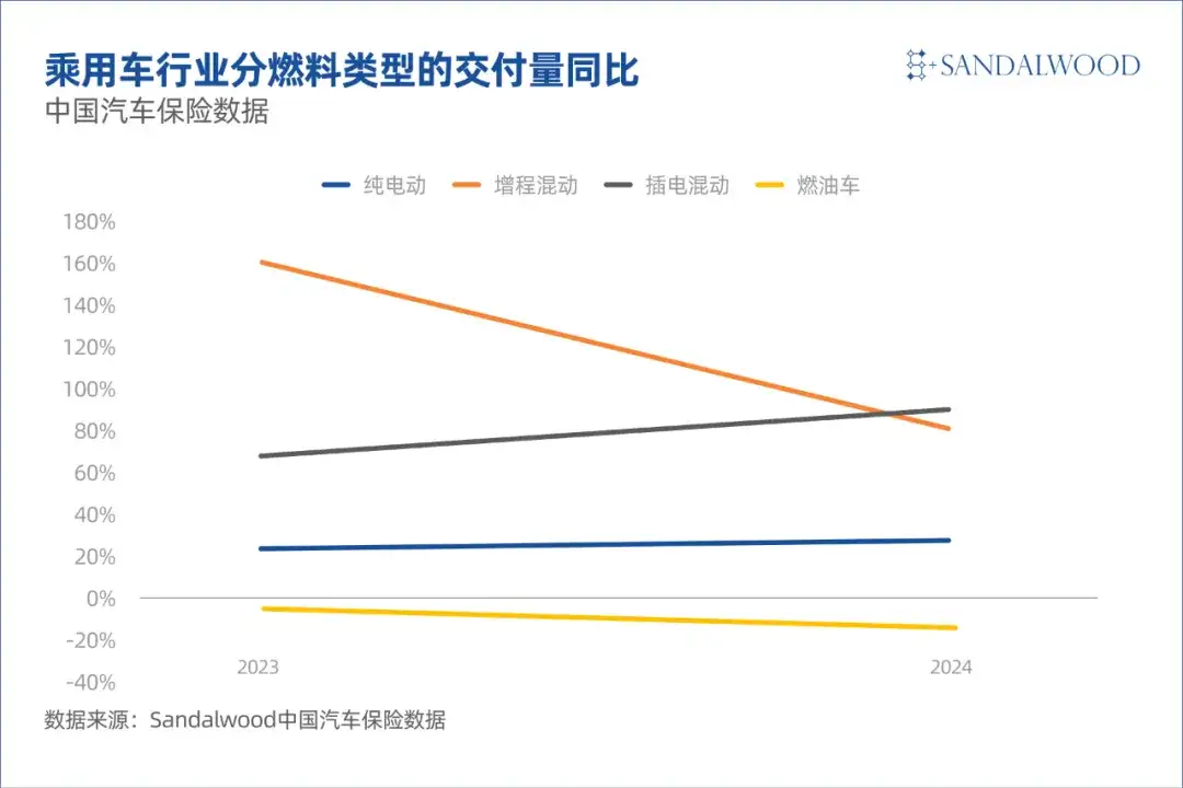 純電動車(BEV)同比增長27%,落後於插電混動和增程混動車型。這是因為消費偏好轉變明顯:插電混動和增程混動憑藉無里程焦慮和更低購置成本(小容量電池)更受青睞。在這樣的趨勢下,插混市場份額翻倍至15%,而燃油車份額從61%降至49%。