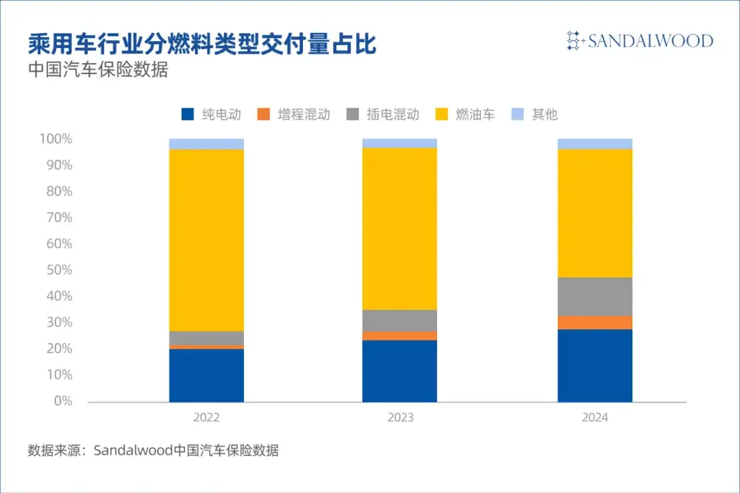 純電動車(BEV)同比增長27%,落後於插電混動和增程混動車型。這是因為消費偏好轉變明顯:插電混動和增程混動憑藉無里程焦慮和更低購置成本(小容量電池)更受青睞。在這樣的趨勢下,插混市場份額翻倍至15%,而燃油車份額從61%降至49%。