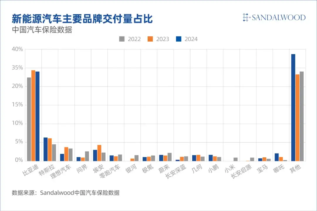 ● 特斯拉的市場份額從2023年的8.3%下降至2024年的6.1%。儘管通過直接降價和5年免息貸款等方式實現了在華交付量的正增長,其年度同比+9%的增速顯著落後新能源車行業的同比+47%。