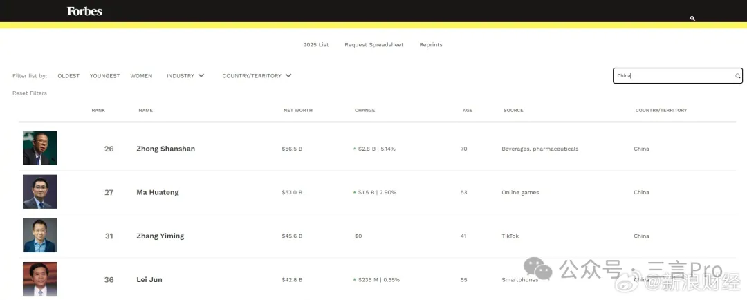而據福布斯的即時榜單顯示,鍾睒睒以564億美元財富排名第一,馬化騰以530億財富排名第二,張一鳴以456億美元財富排名第三,雷軍以430億美元財富排名第四。