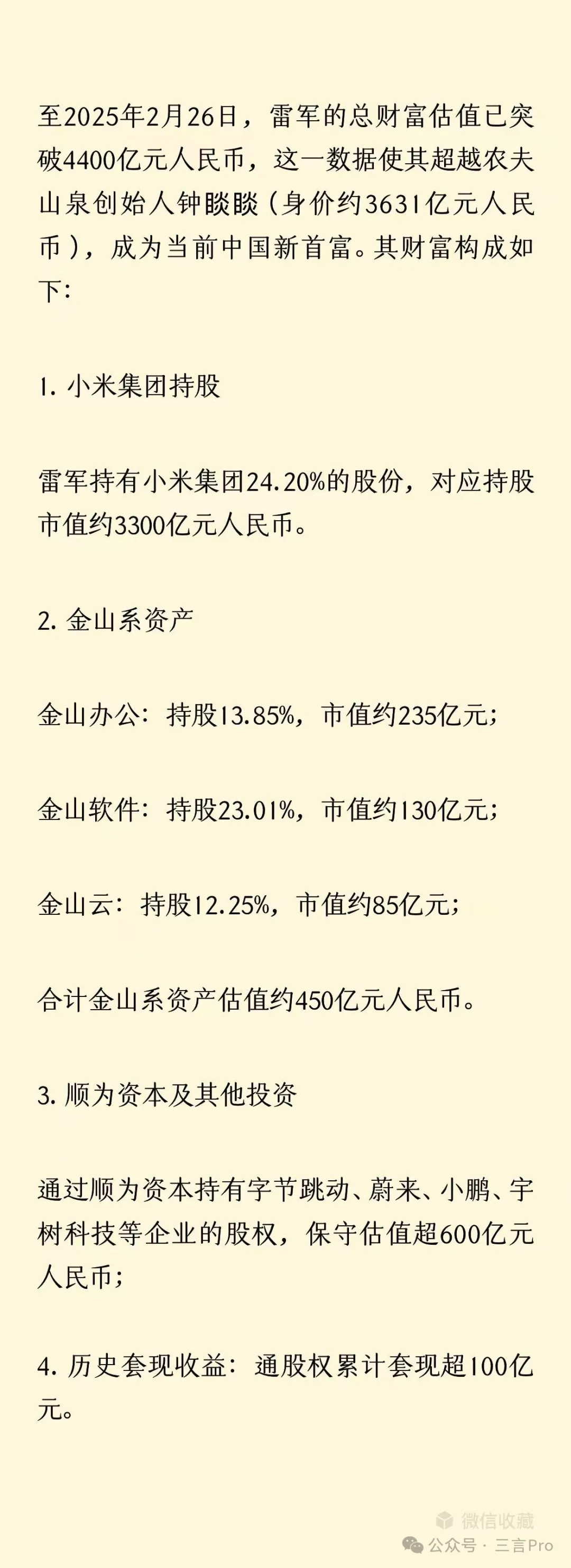 所以以小米集團、金山系上市公司的公開持股來加總計算,雷軍的個人總財富3573億人民幣。
