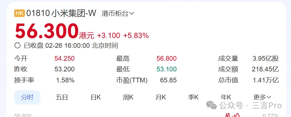 今年以來,小米股價持續升高。2月26日,小米股價以56.6港元收盤,年內累計漲幅超過60%,市值1.4萬億港元。