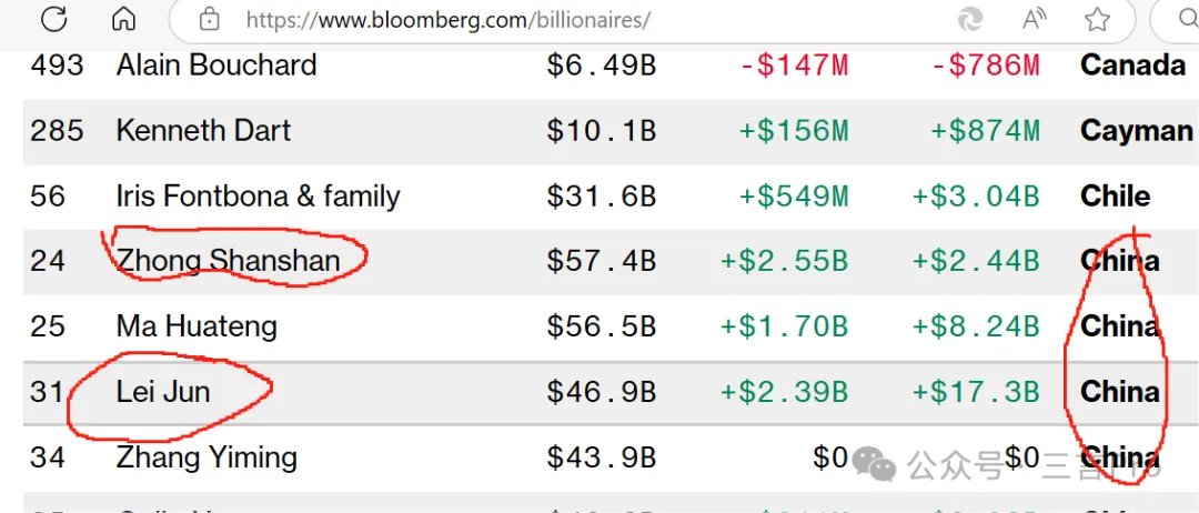 彭博富豪榜單中國企業家排名,目前鍾睒睒以574億美元財富排名第一,馬化騰以565億財富排名第二,雷軍則以469億元財富排名第三。