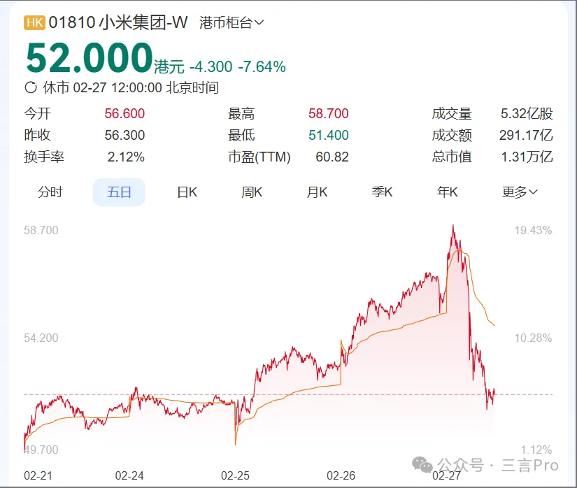 港股午間休市,小米股價下跌7.64%,報52港元。