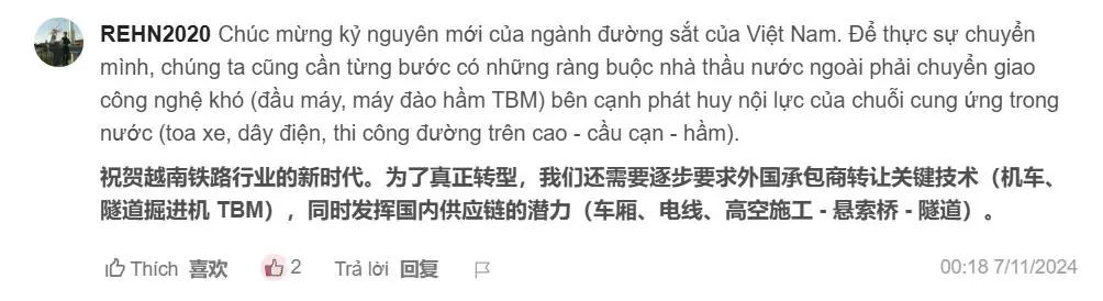 “祝賀越南鐵路從此進入新時代!但要真正實現轉型,我們還需逐步要求外國承包商向越南轉讓諸多關鍵技術,比如機車組和盾構機等。與此同時,我們也要將越南國內供應鏈的實力充分發揮出來,爭取在車廂、電線、高架橋和隧道施工等方面早日實現越南製造。”