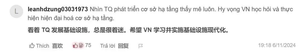 “看到中國基礎設施建設得這麼好,真是令人羨慕啊。真希望我們也能勤加學習,爭取儘早實現越南基建的現代化。”
