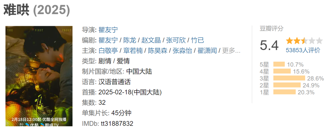 好嗑自然好嗑,甜也夠甜,但如果拋卻熱度、招商等數據看,《難哄》的質量並不突出。豆瓣5.4的評分,證明它雖然下飯,但在大多數觀眾那並不被認可。