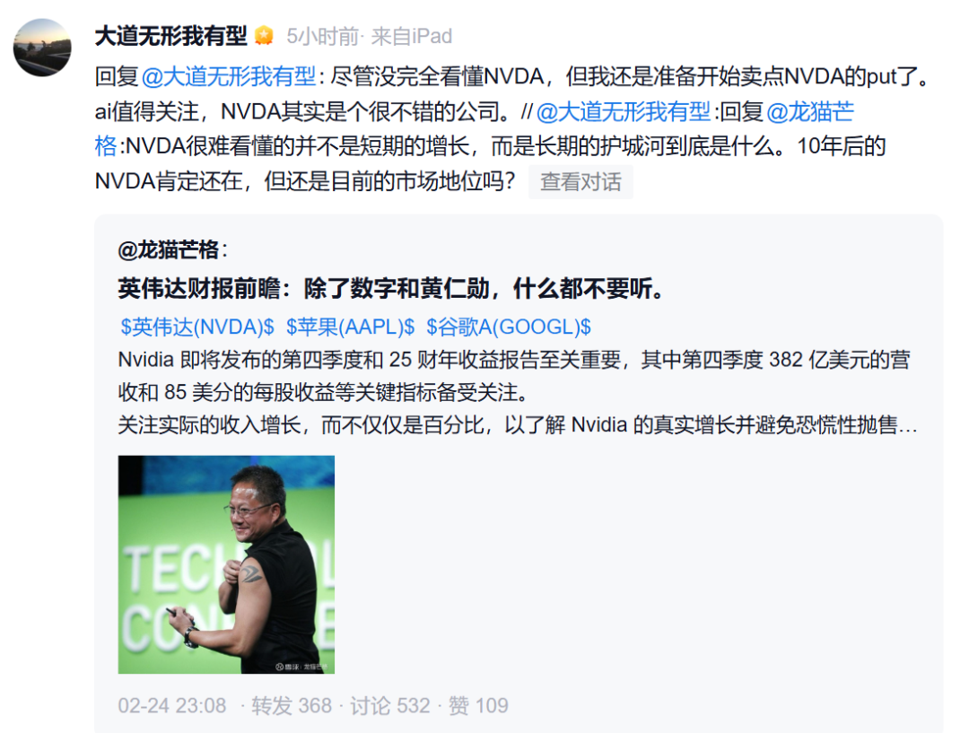 注:“ 大道無形我有型 ” 是段永平的用户暱稱,“ 賣 put ” 是一種投資操作,簡單理解,相當於我願意在某個價位買入英偉達的股票。