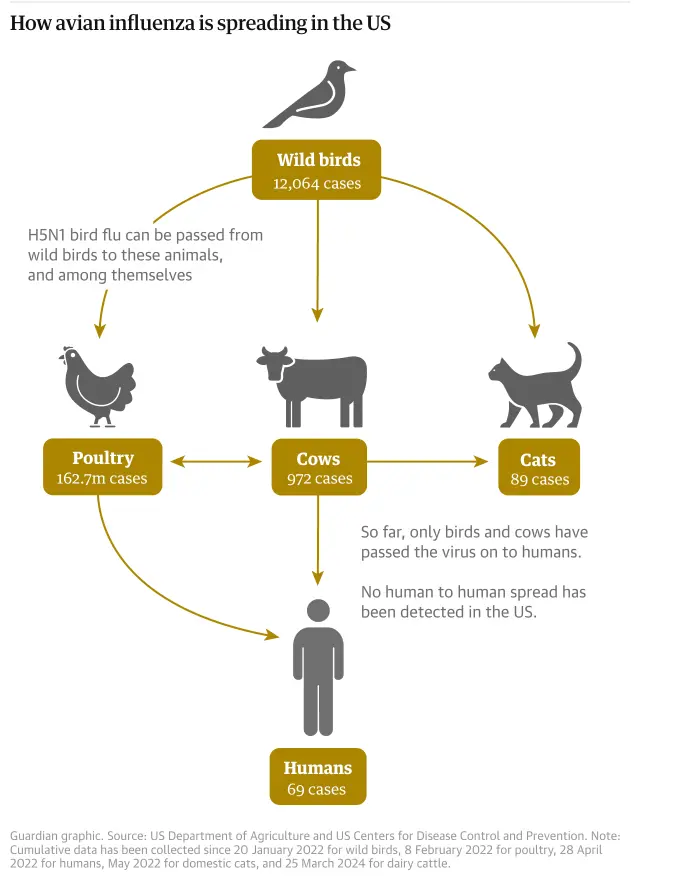 最令人擔憂的是禽流感從牲畜傳染給人類。迄今為止,美國已有 67 人禽流感檢測呈陽性,絕大多數是接觸過家禽或奶牛的農場工人。其中一人死亡,此人住在路易斯安那,在接觸非商業性後院禽類和野生鳥類後感染了該病毒。