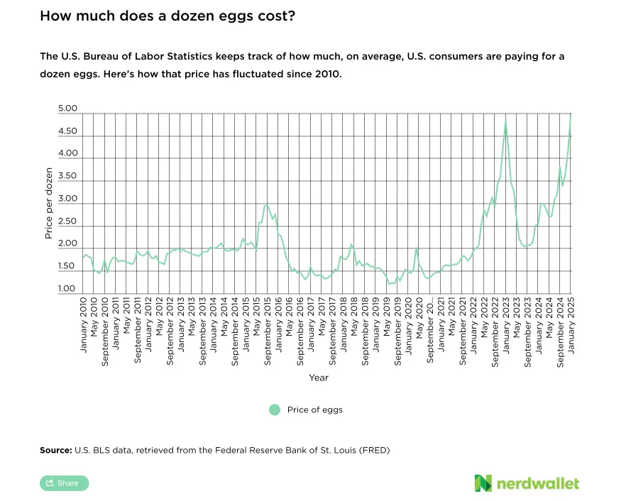 美國華人雜談2025年02月27日 09:56:520人蔘與0評論去年9月,當時的副總統候選人萬斯(JD Vance)站在賓夕法尼亞州雷丁市一家超市的過道上,揮舞着一件政治道具:一盒雞蛋,用它來嘲笑民主黨的“通貨膨脹政策”。雖然萬斯聲稱這些雞蛋每打售價4美元,而他身後的標誌清楚地顯示售價為2.99美元,但他想要傳遞的論點很有説服力。選舉前後的民意調查顯示,對多數選民來説,經濟和通脹是最重要的問題,而約70%的選民表示,他們“非常擔心”食品價格。川普和萬斯都經常承諾,如果當選,將降低雞蛋等日常用品的成本。