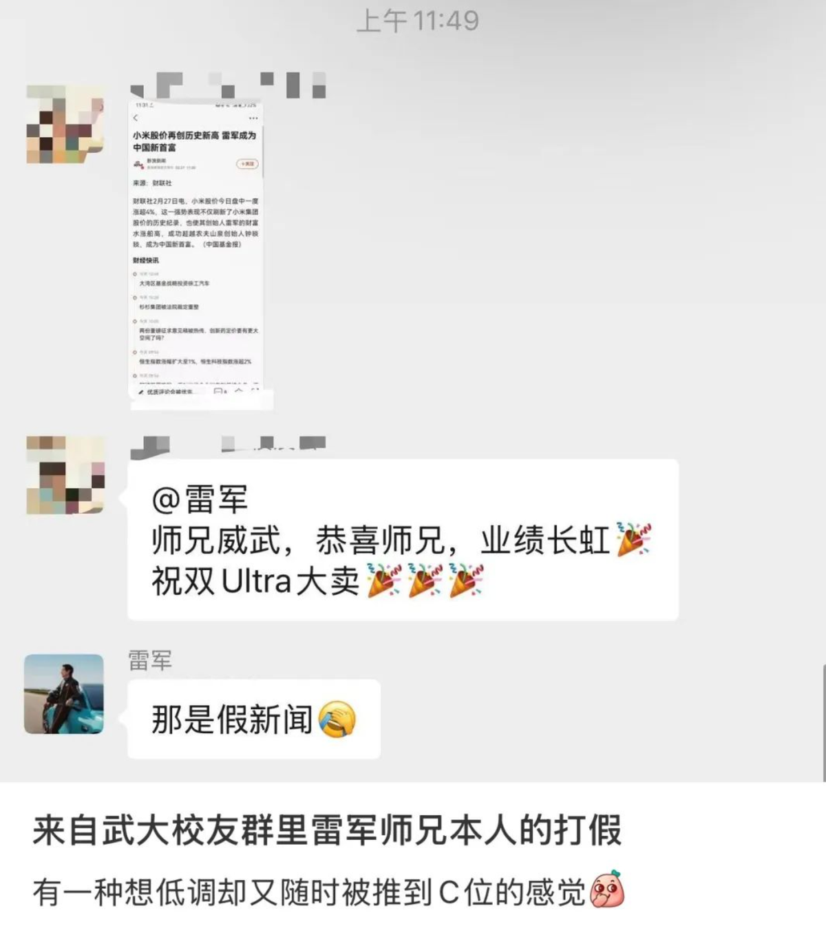 2月26日,小米集團股價飆升至56.8港元。次日上午,股價進一步攀升至58.7元新高,總市值一度突破1.4萬億港元。隨之而來的消息是,小米創始人雷軍的個人身家躍升至約4400億元人民幣,超越農夫山泉鍾睒睒和字節跳動張一鳴,短暫登上中國首富寶座。隨後,雷軍在武大校友羣發消息表示,這是假新聞。