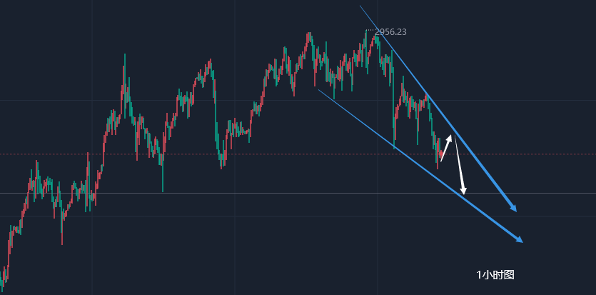 從當下日線級別看,打到了日線中軌,後續有幾個關鍵支撐需關注企穩信號,一個是2876,屬於前期14日至17日起漲點,一個是2868,屬於2582-2956的236分割支撐,最後一次就是2863,屬於高位整理最後一次起漲點;還是那句話,只要2863未有效破位失守,那麼修正就不會深調,切勿低位破支撐後去追跌,因為整體的趨勢依然很強,360美金的單邊漲幅才回調了一個零頭;當然對於今日來講,一路下跌短期弱勢,歐盤反彈力度也不大,今晚還有二次下行概率,只不過入場點至少要靠近小時線中軌承壓再出手,強壓是2914下,下軌支撐2874-76,先圍繞此區間來震盪對待