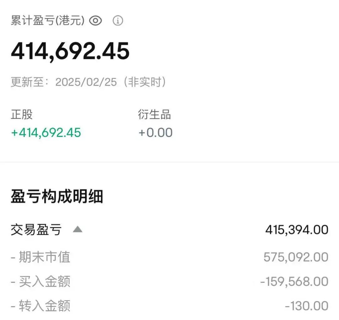 隨着小米SU7發佈以後小米股價的暴漲,湯姆由炒房而來的資金很快迎來高速增值。他也足夠幸運,購買時間點全都卡在了小米股價K線的低谷區域,也就是所謂的“抄底”,他的持倉成本也一路轉負。