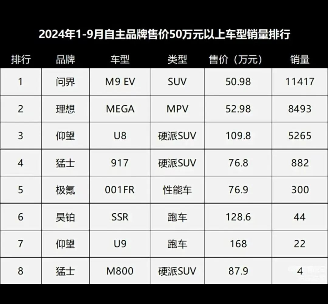 去年前三季度,自主品牌售價50萬以上的車型中有三款銷量達到了四位數,第四名往後的數據和前三名分層明顯,市場高度集中化意味着這個價格段內認可度趨同帶來的“贏家通吃”。