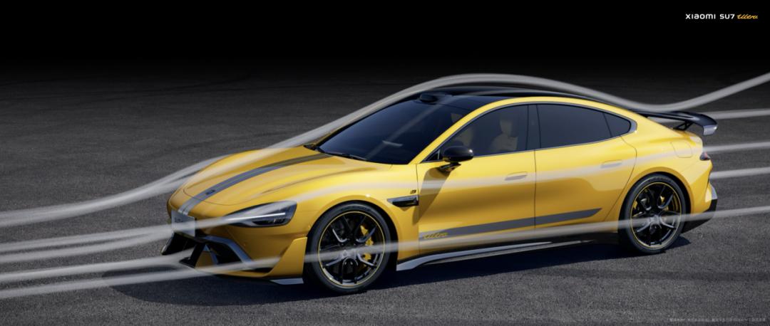 小米SU7 Ultra的設計圍繞巔峯性能展開,新增的設計服務於功能性,沒有多餘的裝飾。外觀設計方面,在小米SU7 Max的基礎上,小米SU7 Ultra加入了空氣動力學套件,車身尺寸進一步加大,長、寬、高、軸距分別為5115mm、1970mm、1465mm、3000mm,車身更修長、更低趴,姿態更戰鬥。小米SU7 Ultra車頭加入超大尺寸前鏟和氣壩,搭配U型風刀,有效增加車輛前部下壓力。進氣格柵開口進一步加大,散熱面積增大10%。尾部新增主動尾部擴散器,兩擋自適應調節,兼顧風阻與下壓力,日常行駛低能耗;同時新增碳纖維固定式大尾翼,尾翼翼展達到1560mm,弦長240mm,高速行駛時帶來可觀的下壓力。得益於全新的空氣動力學設計,小米SU7 Ultra最大下壓力可達285kg,媲美超跑級別車型。