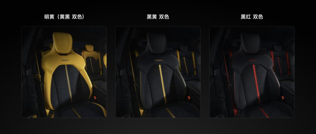 小米SU7 Ultra內飾不僅材質大幅升級,同時採用全新配色,**大膽熱烈的明黃(黃/黑雙色)內飾、炫酷的黑/黃雙色內飾、低調有內涵黑/紅雙色內飾;**舒適性方面,小米SU7 Ultra座椅前排配備座椅通風,新增座椅按摩、雙排增加石墨烯加熱。同時,全車座椅造型、填充物升級,側翼高度提升,包裹性、舒適性更好。