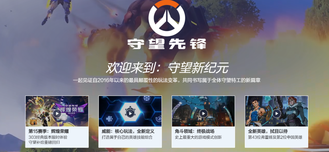 而是在官網主頁用了“ 守望新紀元 ”的説法,並繼續沿用了最初的《 守望先鋒 》無印版 LOGO。