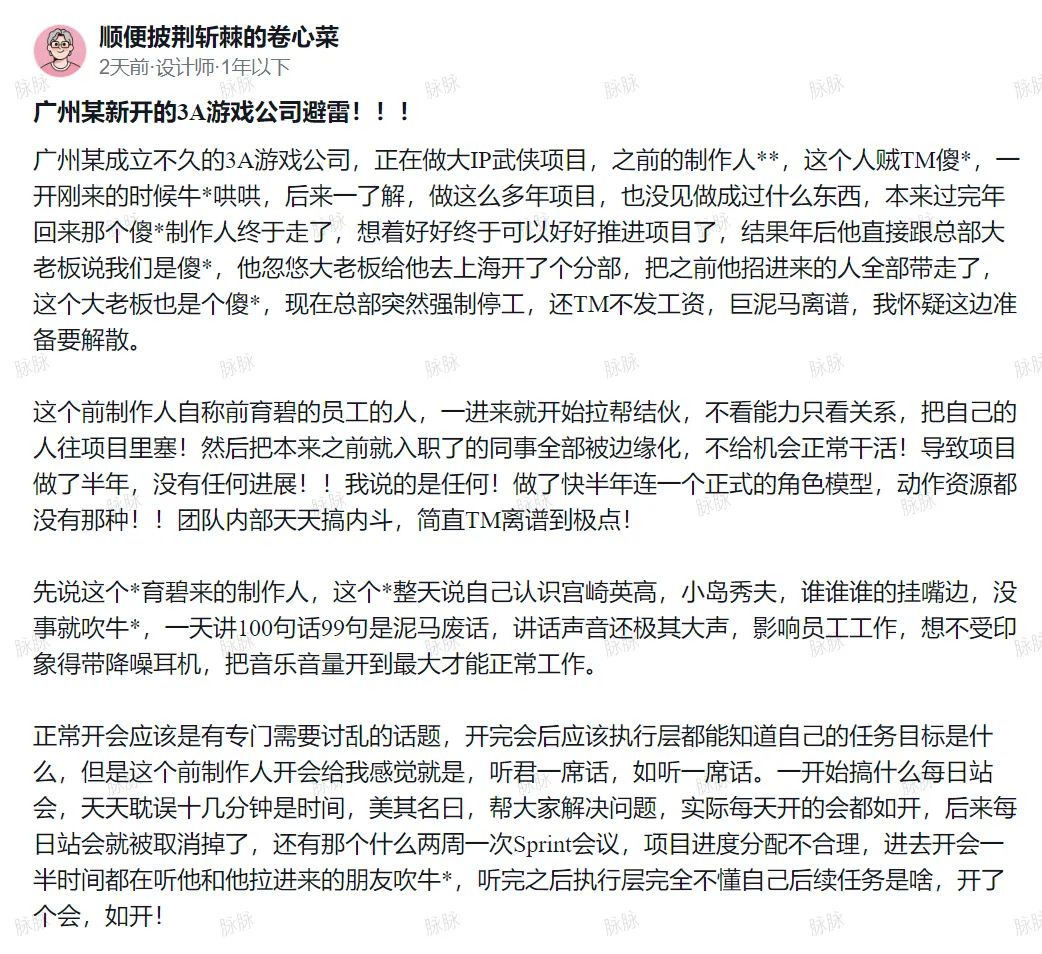 事件爆發後,在脈脈等職場社區上,不少自稱廣州部門員工的用户發帖抨擊過這位製作人,內容多集中在“過度包裝”“拉幫結派”等問題上。
