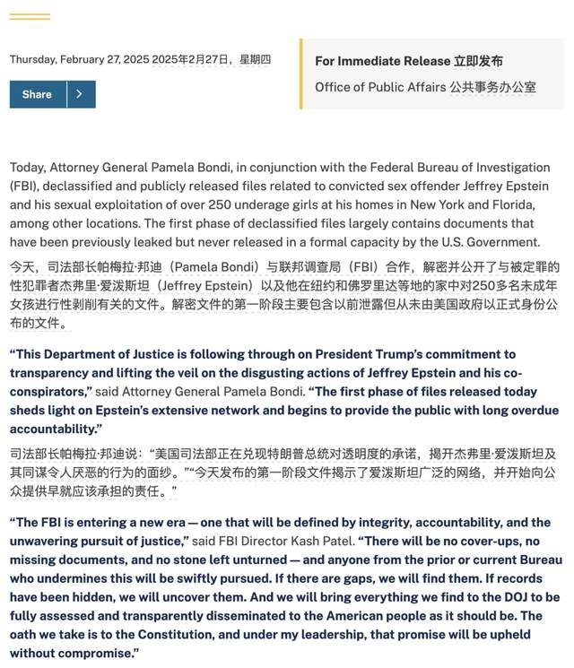等到美國27日上班時間,司法部 公共事務辦公室在網站上如期公佈資料,發佈了題目為“司法部長帕梅拉邦迪發佈第一階段解密的愛潑斯坦文件”,對公佈情況進行了説明,並且提供了相關文件的下載鏈接。