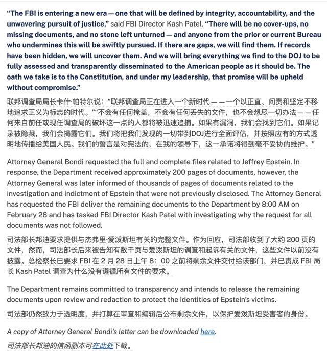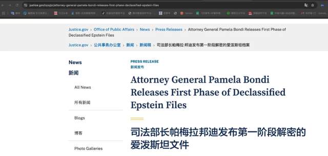 等到美國27日上班時間,司法部 公共事務辦公室在網站上如期公佈資料,發佈了題目為“司法部長帕梅拉邦迪發佈第一階段解密的愛潑斯坦文件”,對公佈情況進行了説明,並且提供了相關文件的下載鏈接。