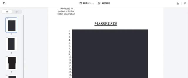 D部分按摩者信息,美司法部公佈時著名“已編輯處理以保護潛在受害者的信息”。一共7頁,一共254人的人員名單全部被塗黑,無法知曉其中任何信息。