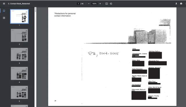 C部分為愛潑斯坦的通訊錄,一個95頁,每頁大約10-13個人,也就是約1000人的聯繫人名單。其中所有通訊方式被塗黑遮蓋,只顯示人員名單。