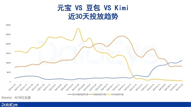 ADX數據顯示,2月5日之前,Kimi、豆包與騰訊元寶投放素材量分層明顯,且存在不小差距。而後,Kimi投放素材量逐步滑落,並在2月15日左右成為三者中最低,至今始終保持着日素材量不超1000組的力度。