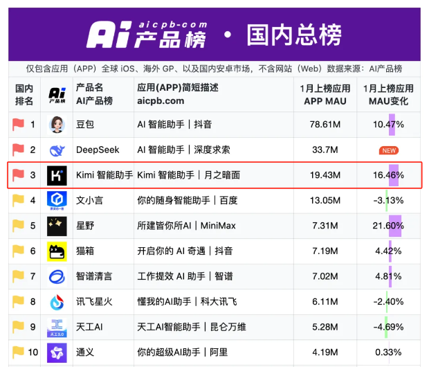 內部受制於仲裁之餘,Kimi的產品似乎也受到了不同層面的壓力,數據大幅回落已成不爭的事實。在春節期間,網傳張予彤朋友圈發佈了Kimi用户進一步增長的相關內容,但從其他機構披露的數據上來看,似乎與之並不相符。根據AIcpb.com發佈的AI應用榜單中,Kimi在1月已經跌落至第三名的位置,其月活數量也從去年10月楊植麟宣佈的3600萬跌落至1943萬。