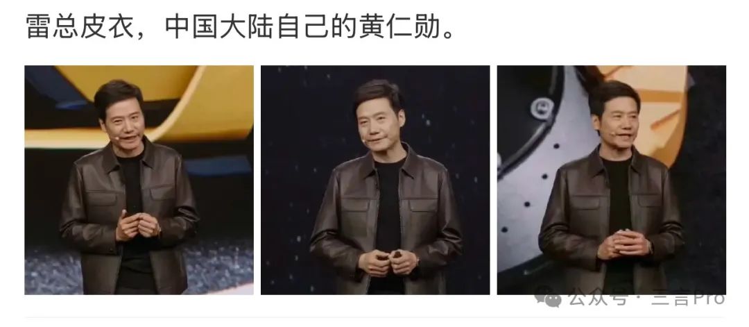 也暗示小米在高端技術領域的野心——正如黃仁勳的皮衣象徵GPU算力,雷軍的皮衣則被賦予“高端光環”“車企老闆的叛逆宣言”等Buff,強化了小米汽車和手機的“Ultra級”定位。傳遞出品牌從“性價比”向“高質感”轉型的決心。