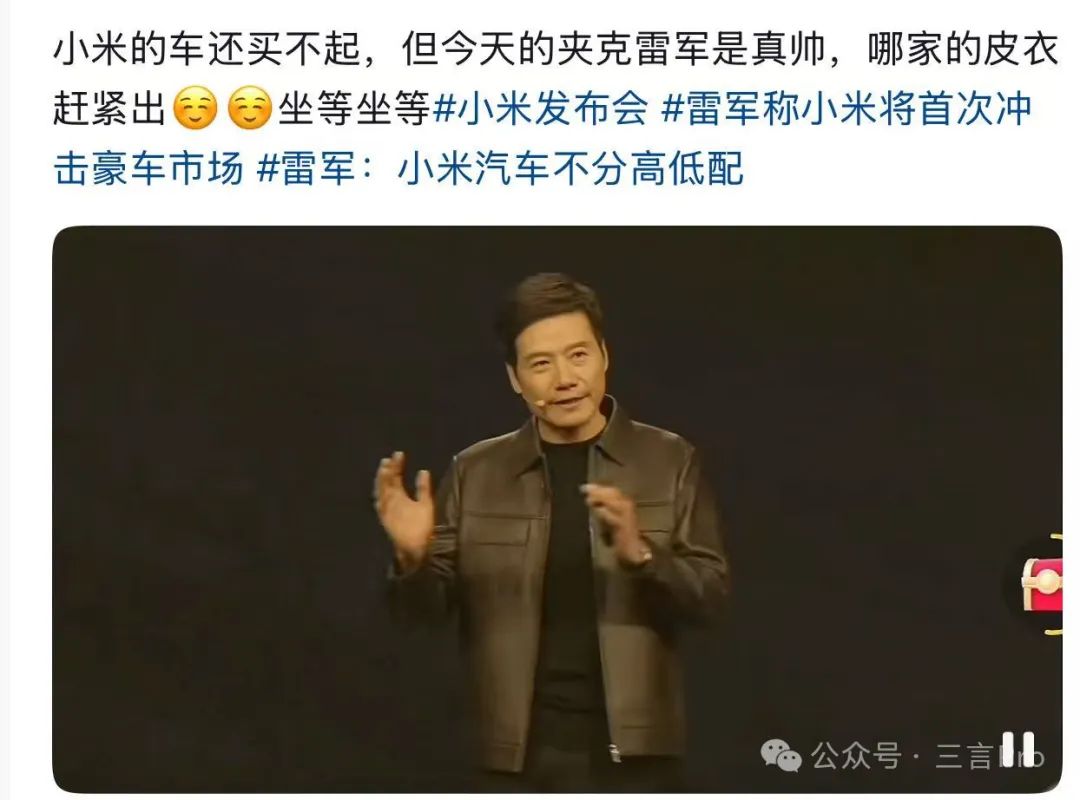 昨晚的小米發佈會,發佈了手機、汽車,我連那個“奧chua”怎麼拼寫都沒記住,但記住了雷總的皮衣,它火出圈了。