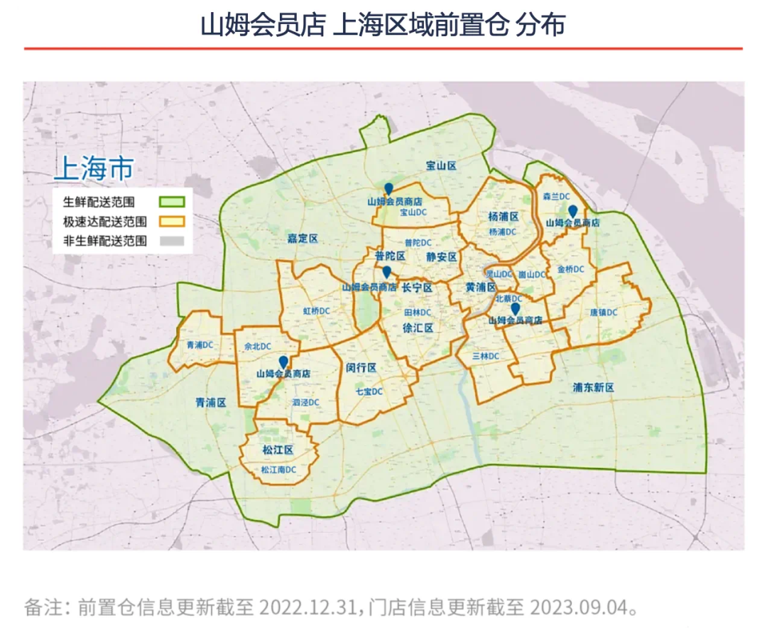 另一邊,山姆大規模佈局前置倉,通過“大店+前置倉”模式,擴大銷售半徑,讓會員享受到“極速達服務”,彌補其在門店便利性上的短板,還有效提高了用户的復購率。