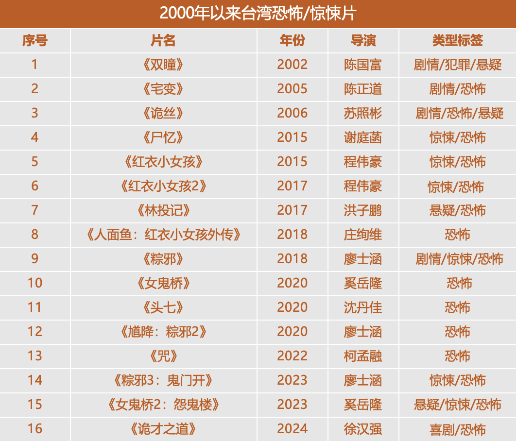 恐怖片,常常與驚悚、懸疑搭配,在台灣電影市場則多表現為靈異元素、都市傳説、恐怖民俗、陰間故事等內容。前兩年在流媒體爆火的《鬼家人》,以及此刻正在內地上映的《詭才之道》,雖然談不上真正意義上的恐怖,但也是“鬼”元素+喜劇類型融合的作品,並有着反類型新意。