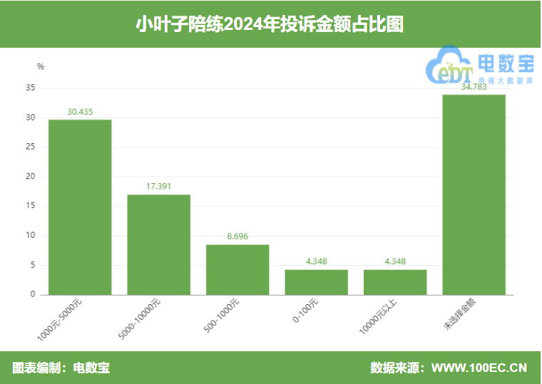 據網經社“電數寶”大數據庫顯示,用户投訴“小葉子智能陪練”的消費金額主要在1000-5000元(30.435%)、5000-10000元(17.391%)、500-1000元(8.696%)、0-100(4.348%)、10000元以上(4.348%)、未選擇金額區間(34.783%)。