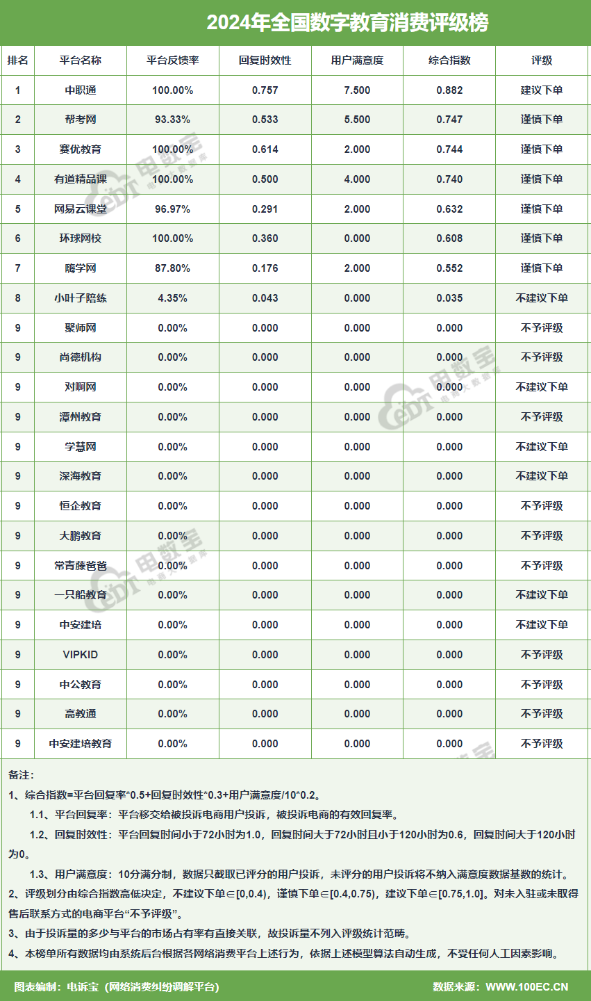 在“2024年全國數字教育消費評級榜”中,中職通獲**“建議下單”評級;幫考網、賽優教育、有道精品課、網易雲課堂、環球網校、嗨學網、尚德機構獲“謹慎下單”評級;聚師網、尚德機構、騰訊課堂、潭州教育、芸學教育、高頓教育、恆企教育、大鵬教育、常青藤爸爸、VIPKID、中公教育、高教通、中安建培教育等獲“不予評級”;小葉子陪練、對啊網、學彗網、深海教育、一隻船教育、中安建培獲“不建議下單”**評價。