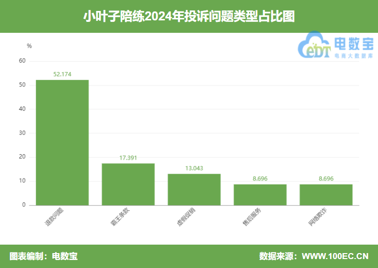 據網經社“電數寶”大數據庫顯示,“小葉子智能陪練”涉嫌存在**退款問題(52.174%)、霸王條款(17.391%)、虛假促銷(13.043%)、售後服務(8.696%)、網絡欺詐(8.696%)**等問題。