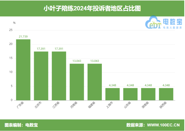 據網經社“電數寶”大數據庫顯示,2024年投訴“小葉子智能陪練”的用户主要集中地區依次為廣東省(21.739%)、江蘇省(17.391%)、浙江省(17.391%)、河南省、福建省、山東省、山西省、廣東省、江蘇省、海外、湖北省、貴州省、重慶市。