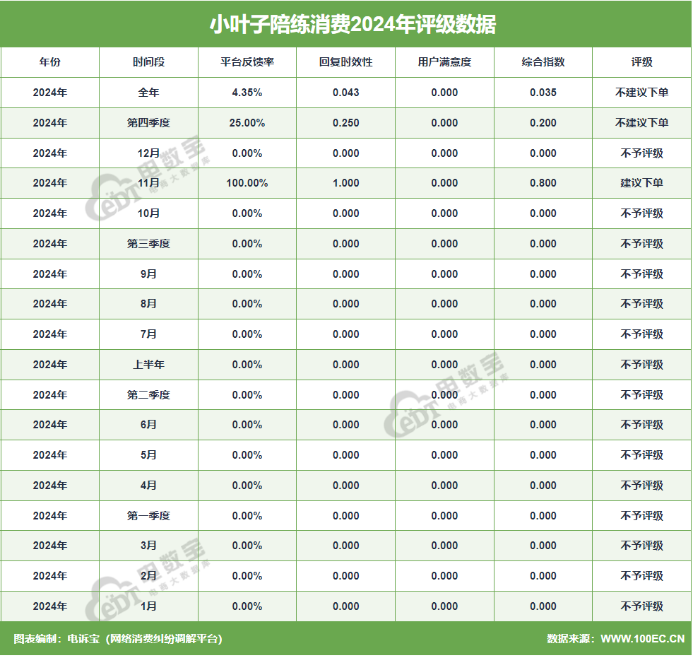 今天發佈的是“小葉子智能陪練”電訴寶消費評級數據。據網經社旗下電商大數據庫“電數寶”監測數據顯示,2024年“小葉子智能陪練”共獲得18次消費評級,15次為**“不予評級”評級,2次為“不建議下單”,2024年整體消費評級為“不建議下單”。**