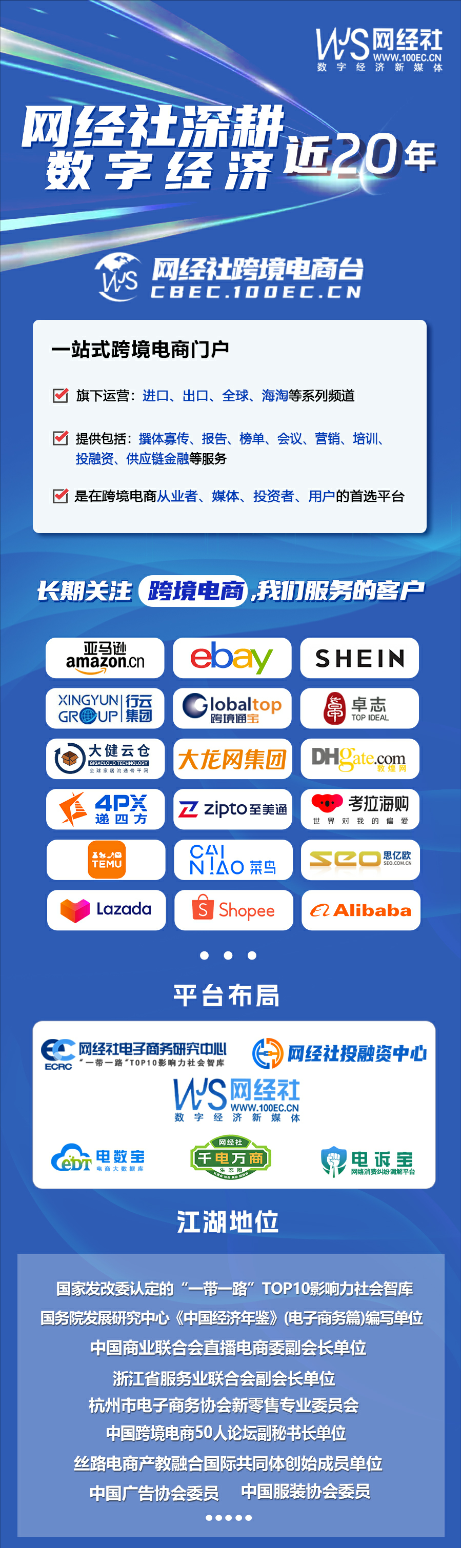 網經社深耕數字經濟行業近20年,長期關注跨境電商,旗下跨境電商台服務的客户:亞馬遜、eBay、SHEIN、行雲集團、跨境通、卓志、大健雲倉、大龍網、敦煌網、遞四方、至美通、考拉海購、Temu、菜鳥網絡、百事泰、思億歐、海航集團、阿里巴巴等。