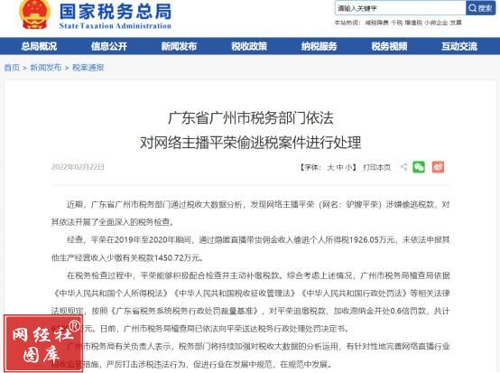 2022年2月22日,廣東省廣州市税務部門通過税收大數據分析,發現平榮涉嫌偷逃税款,隨後依法對其開展了全面深入的税務檢查。經查實,平榮隱匿個人收入偷逃個人所得税1926.05萬元,未依法申報其他生產經營收入少繳税款1450.72萬元。廣州市税務局稽查局依據相關法律法規,對平榮追繳税款、加收滯納金並處0.6倍罰款,共計6200.3萬元。